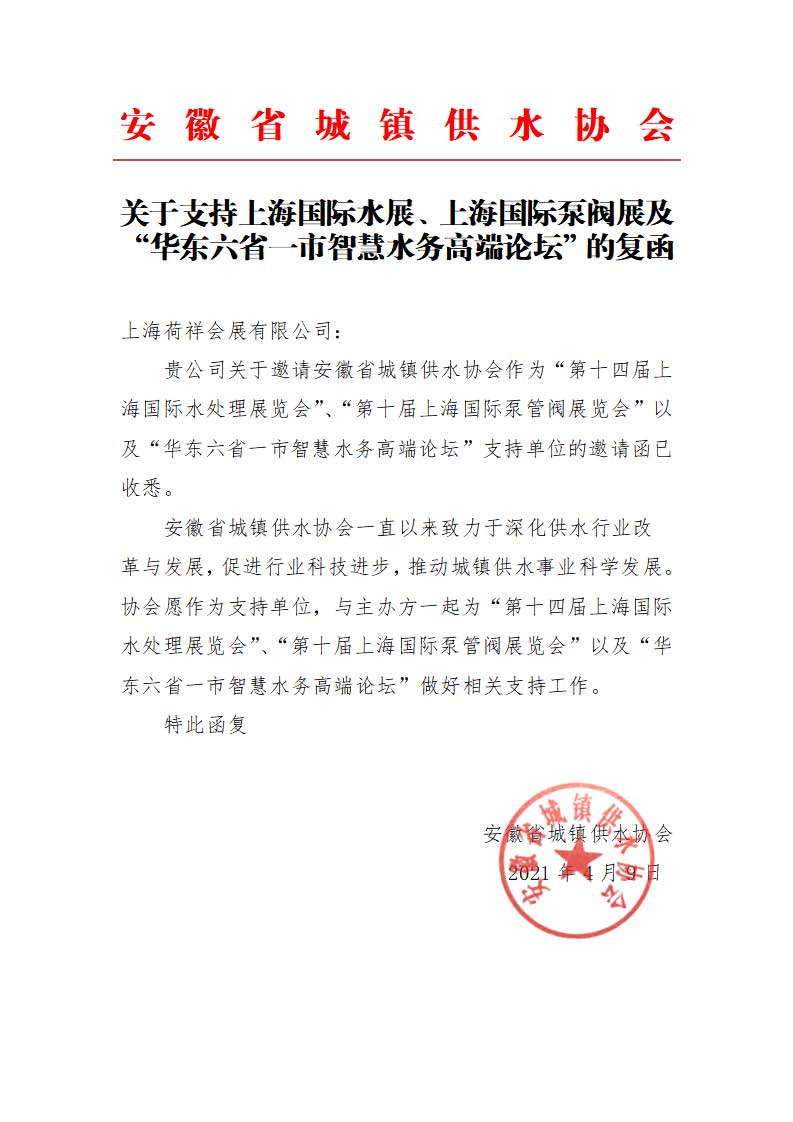 為幫助安徽省水務企業進一步開拓市場,促進國內外企業之間的經貿合作與技術交流,安徽省城鎮供水協會決定將全力支持 2021 年 6 月 2 日在上海國家會展中心(虹橋)舉辦的2021華東六省一市智慧水務高端論壇,與主辦方上海荷祥會展有限公司攜手為城鎮水務行業搭建一個國際性商貿交流平臺,助力企業更好的抓住行業機遇,積極促進我國城鎮水務行業在"十四五"期間獲得快速發展。