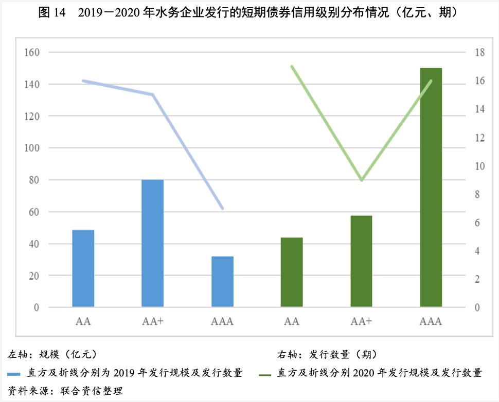 2020年,水務企業(yè)短期債券發(fā)行期數(shù)及規(guī)模繼續(xù)上升,各級別發(fā)行主體中,aa級主體發(fā)債期數(shù)仍然最多,發(fā)行規(guī)模延續(xù)了向高級別集中的趨勢。