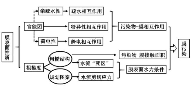 因此,全面總結(jié)膜污染與膜表面性質(zhì)相關(guān)性方面的研究進(jìn)展,對膜材料研發(fā)和膜污染控制具有重要的指導(dǎo)意義。根據(jù)污染物不同,膜污染類型可分為有機(jī)污染、無機(jī)污染、結(jié)垢污染和生物污染4大類。有機(jī)污染主要由進(jìn)水中的腐殖質(zhì)、多糖和蛋白質(zhì)等溶解性有機(jī)物導(dǎo)致,對應(yīng)膜污染研究中常用的模型污染物分別為腐殖酸(ha) 或富里酸(fa) 、海藻酸鈉(sa) 和牛血清蛋白(bsa) 。無機(jī)污染是由水體中的鋁、鐵、硅等無機(jī)膠體和微粒造成的污染,而結(jié)垢污染一般指的是鈣等二價陽離子的碳酸鹽、硫酸鹽和磷酸鹽以及硅酸等物質(zhì)在膜表面的結(jié)晶或沉積。生物污染則由粘附在膜表面的微生物及其代謝產(chǎn)物引起,二者共同形成生物膜后會進(jìn)一步加重生物污染。在實(shí)際應(yīng)用中,通常出現(xiàn)的是由多種污染物共存造成的復(fù)合污染,并且進(jìn)水水質(zhì)的差異也會導(dǎo)致膜污染的主要類型有所不同。影響膜污染行為的關(guān)鍵性質(zhì)主要包括膜表面的親疏水性、荷電性、官能團(tuán)種類以及粗糙度(詳見圖1) 。前3項(xiàng)理化性質(zhì)決定了膜材料與特定污染物之間的疏水作用、靜電作用以及氫鍵等特異性相互作用,而膜表面粗糙度則通過粗糙結(jié)構(gòu)、規(guī)則圖案等形貌特征影響污染物與膜的接觸面積以及錯流過濾時膜表面的水力條件。