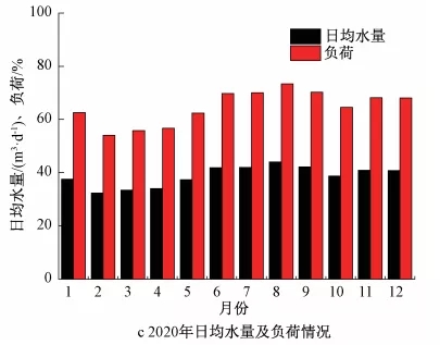 受城市生產(chǎn)活動的影響,污水處理廠在實際運行過程中不同時段、季節(jié)來水水量呈規(guī)律性波動。水力負荷過低或水量時變化系數(shù)過大對回流液do濃度、內(nèi)回流比等脫氮重點指標控制會帶來一定困難。以再生水廠2020年來水情況為例,水量峰谷差值比例超過50%(見圖3a),瞬時最低負荷僅為設計值的30%。不同月份水量差異也較為明顯,最低負荷僅為設計值的53%(見圖3c)。