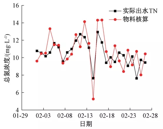 結(jié)果表明,模擬結(jié)果與實際出水tn濃度較為接近,相關(guān)性為0.67,在實際水廠運行中具有較強的相關(guān)性,該平衡方程式能夠較好的預測出水tn變化情況,并為實際生產(chǎn)提供指導。