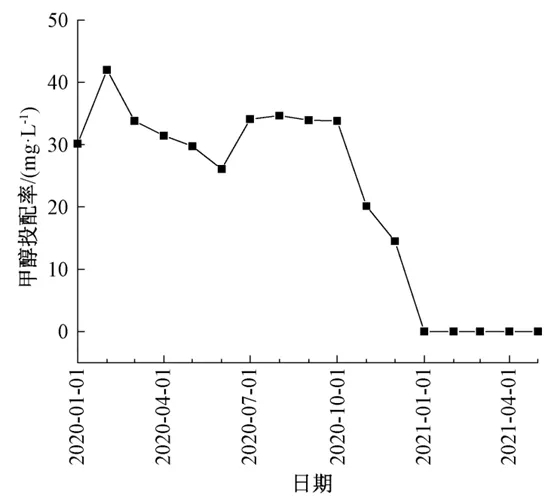 (4) 通過建立氮的物料平衡模型,對工藝運行參數(shù)進行過程控制,再生水廠甲醇投配率逐漸降低,于2021年實現(xiàn)了碳源零投加。