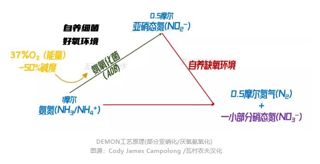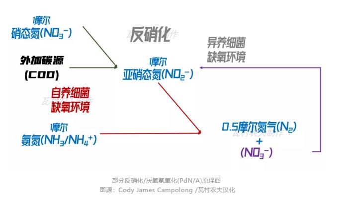 為什么要選擇進行部分反硝化的反應(yīng)呢?請大家先再看一眼上邊的圖片:部分亞硝化/厭氧氨氧化(partial nitritation-anammox)除了能將亞硝酸鹽和氨氮轉(zhuǎn)化成氮氣之外,還不可避免地生成硝酸鹽。