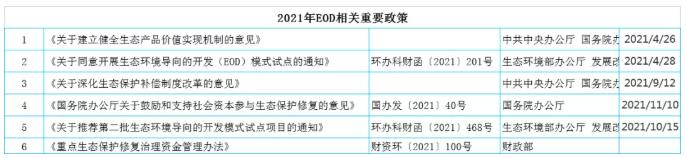 2021年,從政策層面的進(jìn)一步明確到試點推進(jìn)的不斷加深,eod模式落地加速。根據(jù)環(huán)境商會觀察,一是2021年全年,相關(guān)政策陸續(xù)發(fā)布,對eod的支持力度加大。